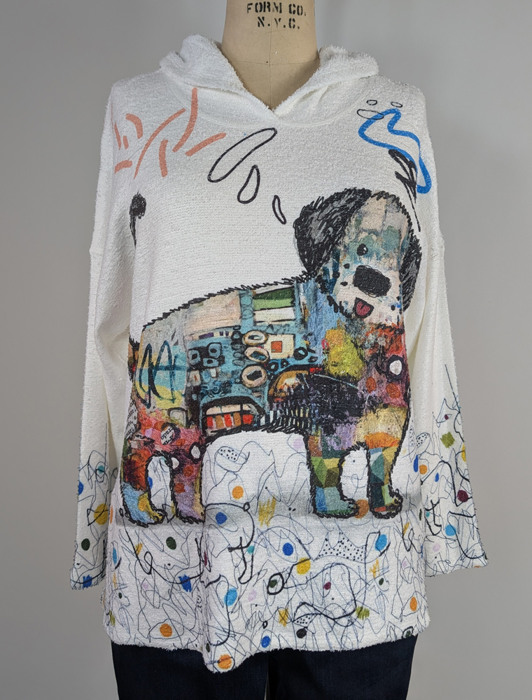 Cute as a button dog motif filled with abstract art and bordered by delightful colorful squiggles, on a hooded top. Material is soft to the touch. Top has dropped long sleeves and hi-lo hem. Center back measures 27 inches on size Medium. Picture is of size small on size 8 Wolf dress form.